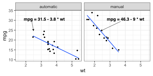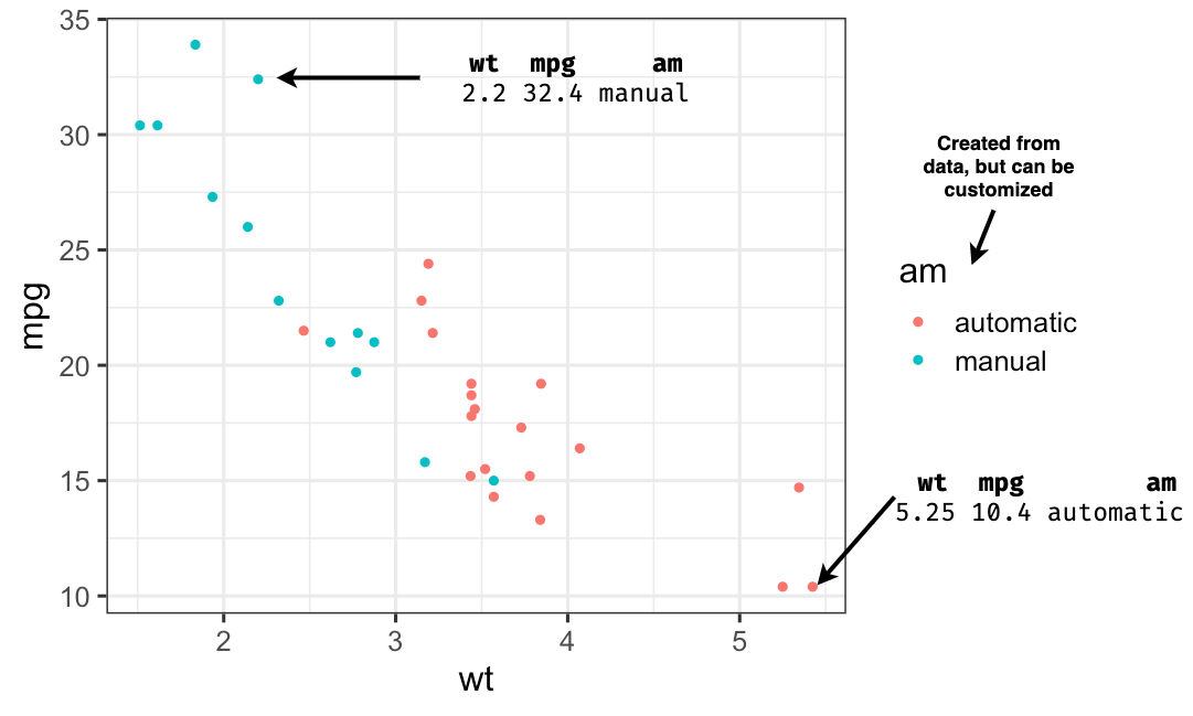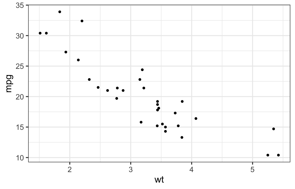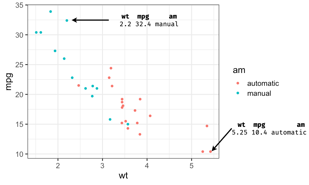 #> # A tibble: 32 x 5#> name wt mpg am cyl#> <chr> <dbl> <dbl> <chr> <dbl>#> 1 Mazda RX4 2.62 21 manual 6#> 2 Mazda RX4 Wag 2.88 21 manual 6#> 3 Datsun 710 2.32 22.8 manual 4#> 4 Hornet 4 Drive 3.22 21.4 automatic 6#> 5 Hornet Sportabout 3.44 18.7 automatic 8#> 6 Valiant 3.46 18.1 automatic 6#> 7 Duster 360 3.57 14.3 automatic 8#> 8 Merc 240D 3.19 24.4 automatic 4#> 9 Merc 230 3.15 22.8 automatic 4#> 10 Merc 280 3.44 19.2 automatic 6#> # … with 22 more rowslibrary(ggplot2)