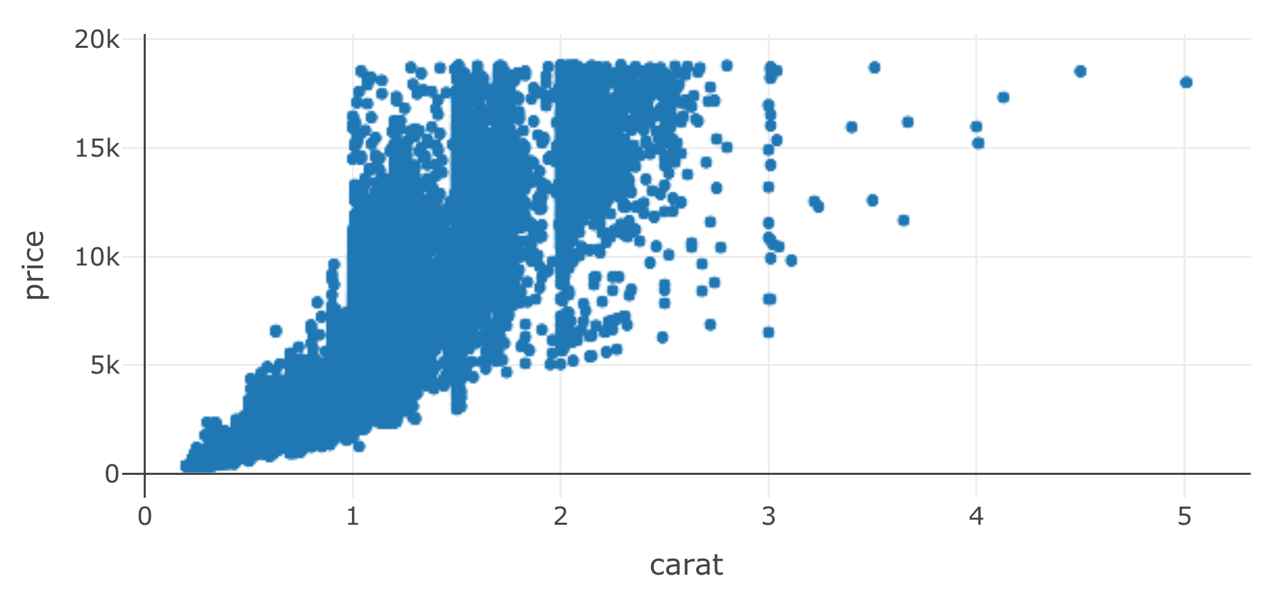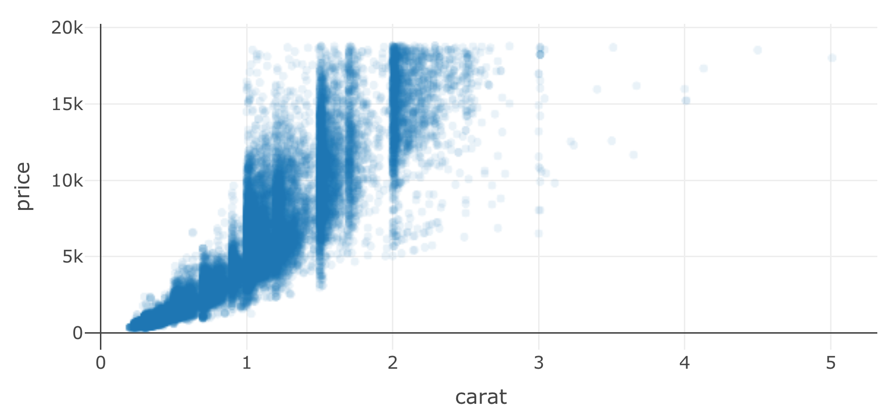 add_markers(x = ~carat, y = ~price, alpha = 0.1) %>%