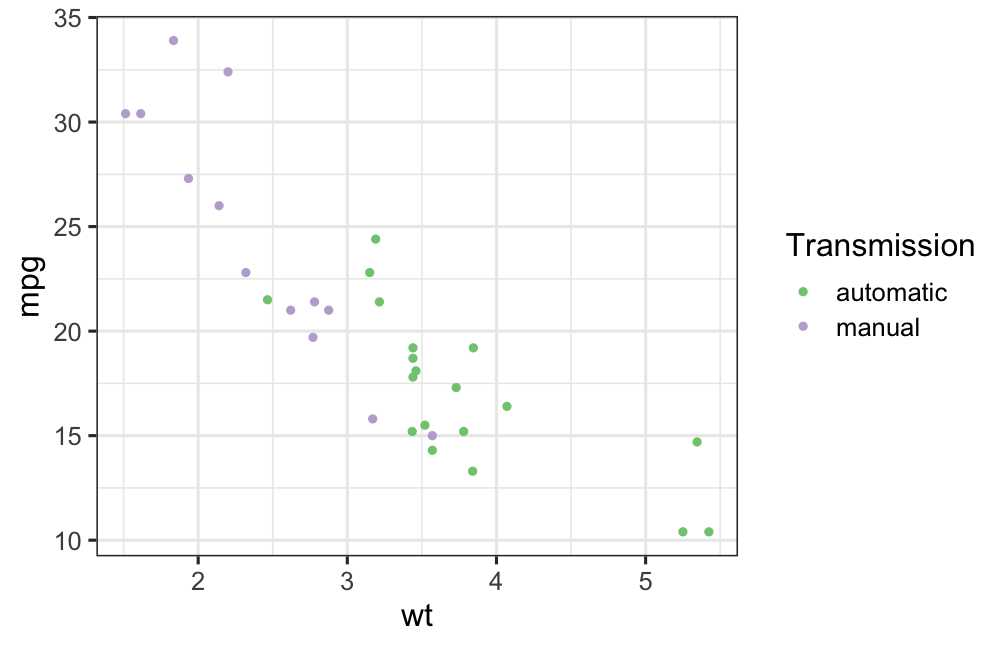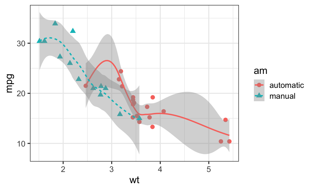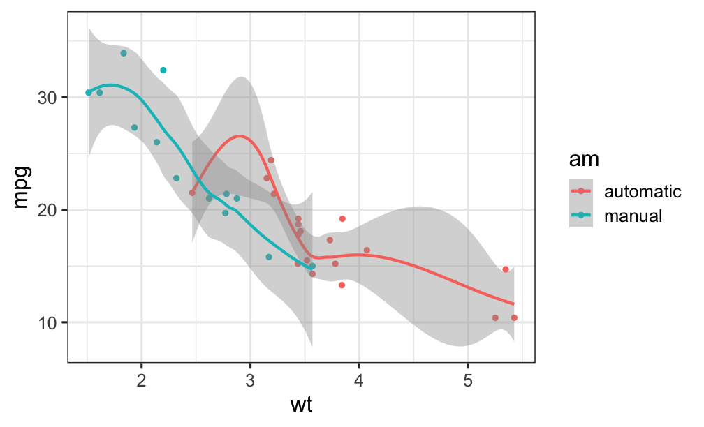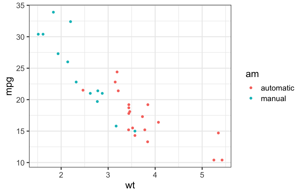 p <- ggplot(mtcars, aes(x = wt, y = mpg, color = am)) +