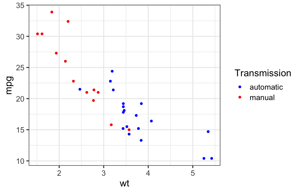 scale_color_manual("Transmission", values = c(automatic="blue", manual="red"))