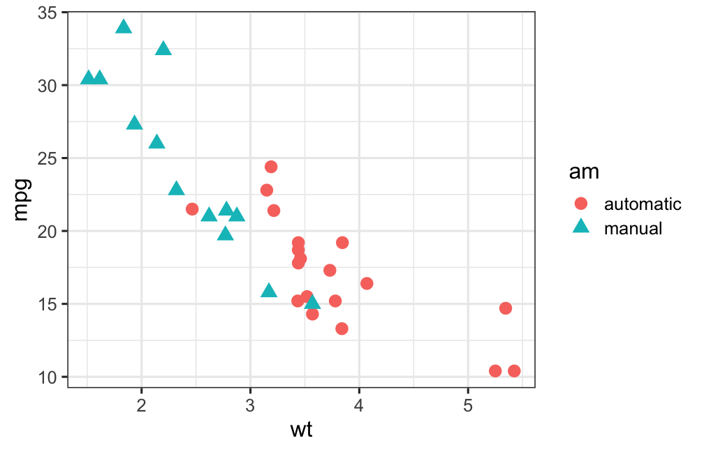 geom_point(mapping = aes(x = wt, y = mpg, color = am, shape = am), size = 4)