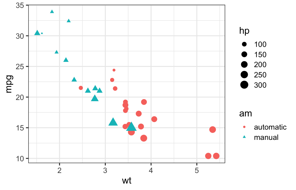 geom_point(mapping = aes(x = wt, y = mpg, color = am, shape = am, size = hp))