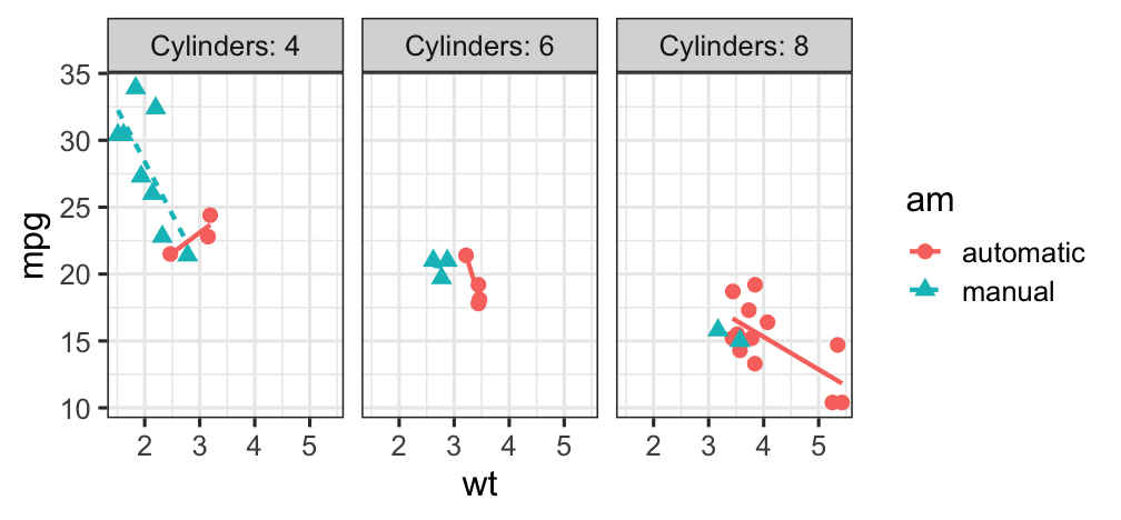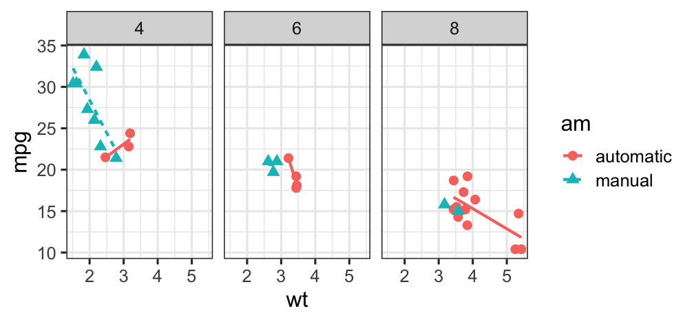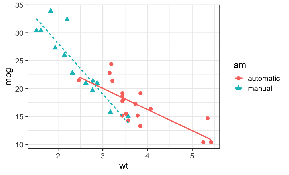 geom_smooth(aes(linetype = am), method = "lm", se = FALSE) +