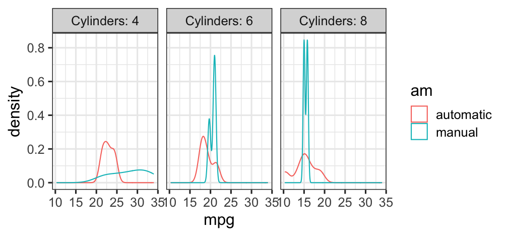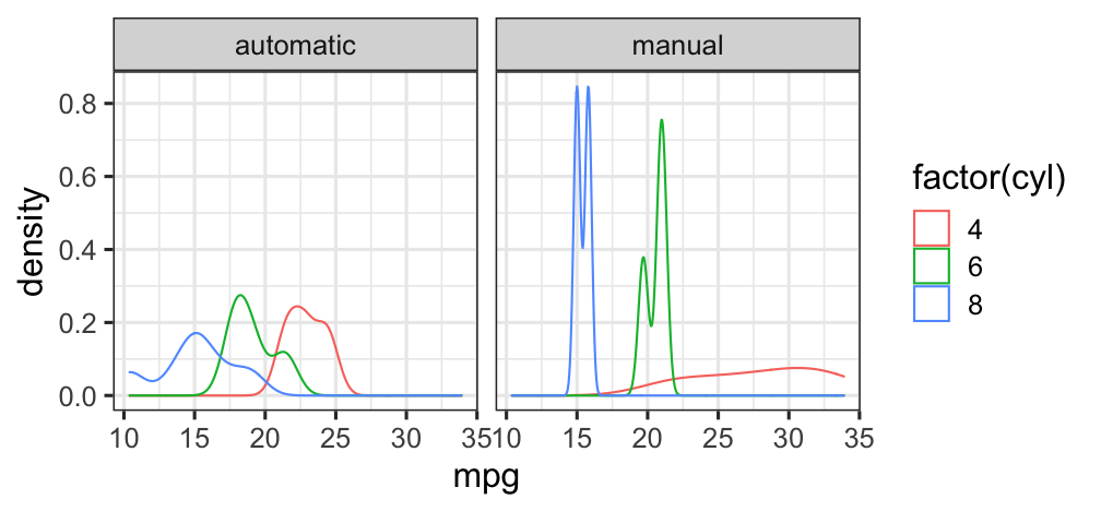 ggplot(mtcars, aes(x = mpg, color = factor(cyl))) +