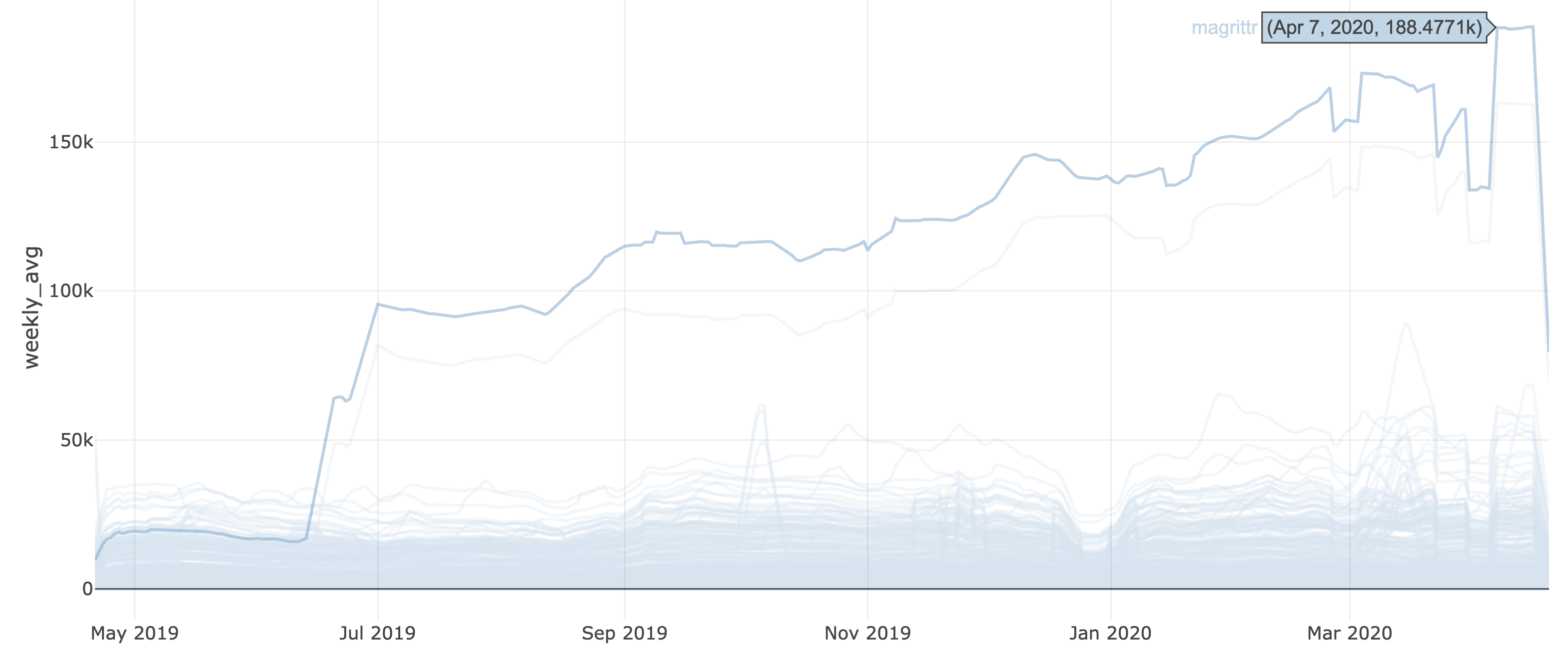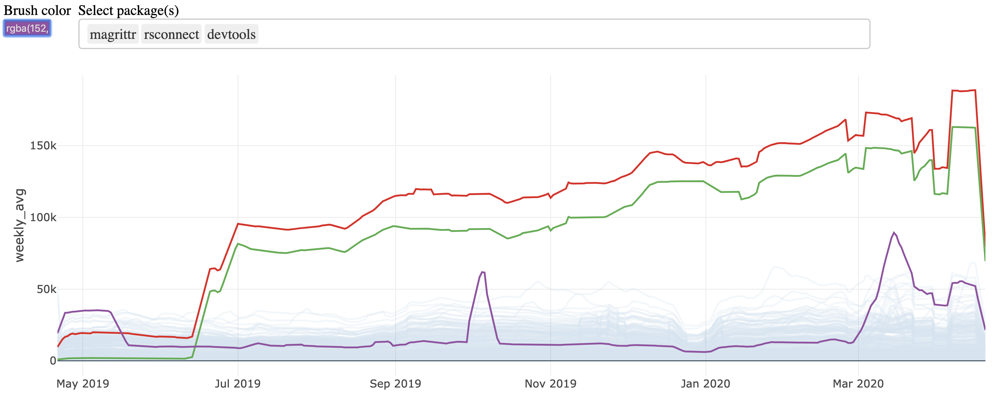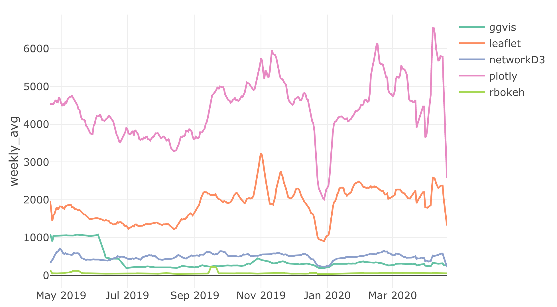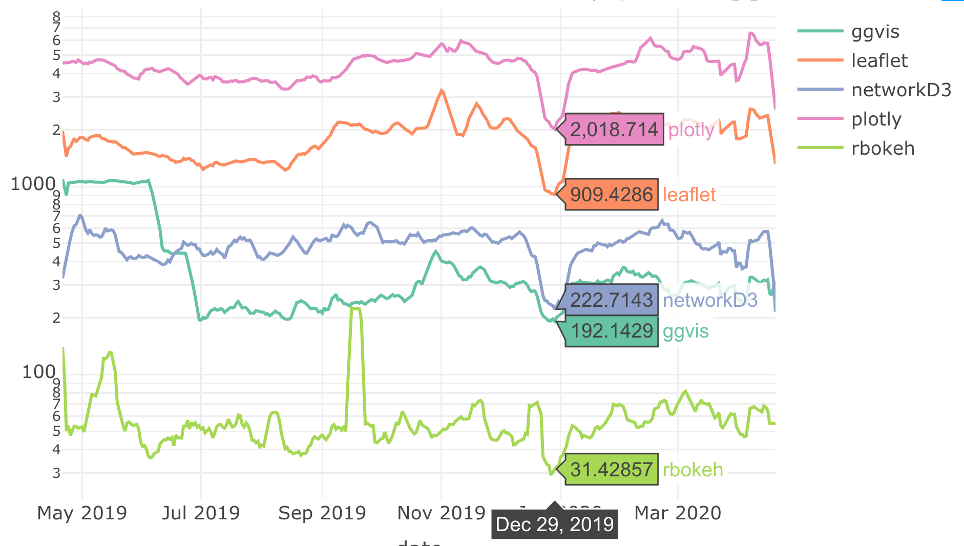 plot_ly(logs) %>% add_lines(x = ~date, y = ~weekly_avg, color = ~package) %>% layout(yaxis = list(type = "log"), hovermode = "compare")