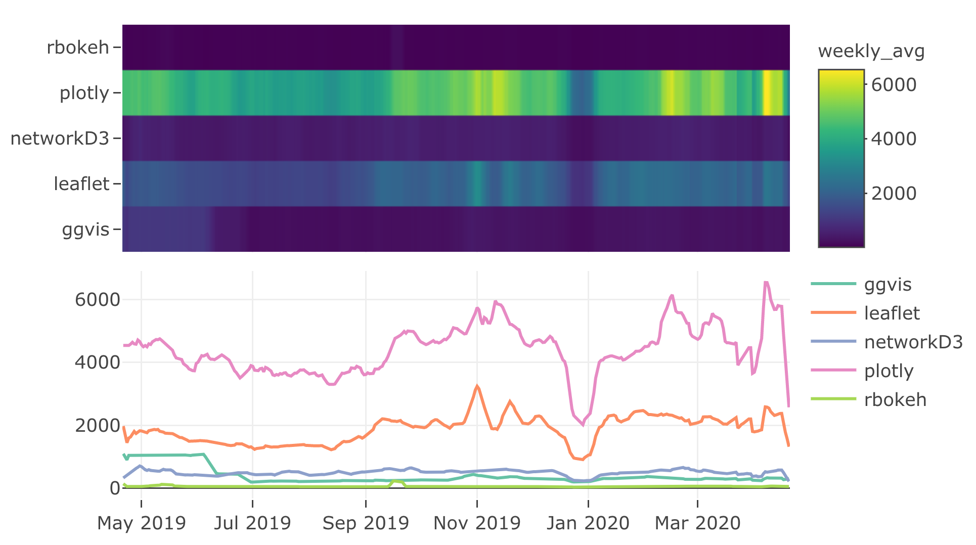 subplot(shareX = TRUE, nrows = 2, plot_ly(logs) %>% add_heatmap(x = ~date, y = ~package, z = ~weekly_avg), plot_ly(logs) %>% add_lines(x = ~date, y = ~weekly_avg, color = ~package))