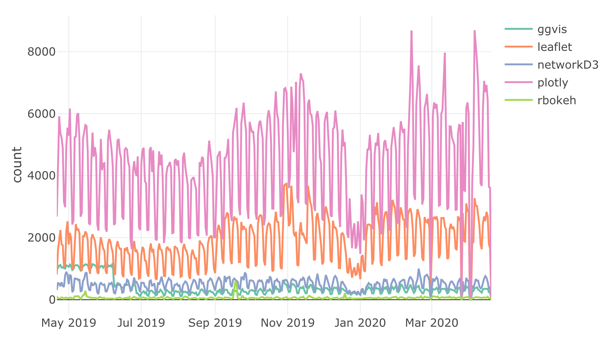 ── Data Summary ──────────────────────── ValuesName logs Number of rows 1830 Number of columns 3 _______________________ ── Variable type: character ─────────────────────────────────────────────────────────────── skim_variable n_missing complete_rate min max empty n_unique whitespace1 package 0 1 5 9 0 5 0── Variable type: Date ──────────────────────────────────────────────────────────────────── skim_variable n_missing complete_rate min max median n_unique1 date 0 1 2019-04-21 2020-04-20 2019-10-20 366── Variable type: numeric ───────────────────────────────────────────────────────────────── skim_variable n_missing complete_rate mean sd p0 p25 p50 p75 p100 hist 1 count 0 1 1441. 1787. 0 211 573 2229 8690 ▇▂▁▁▁plot_ly(logs) %>% add_lines(x = ~date, y = ~count, color = ~package)
