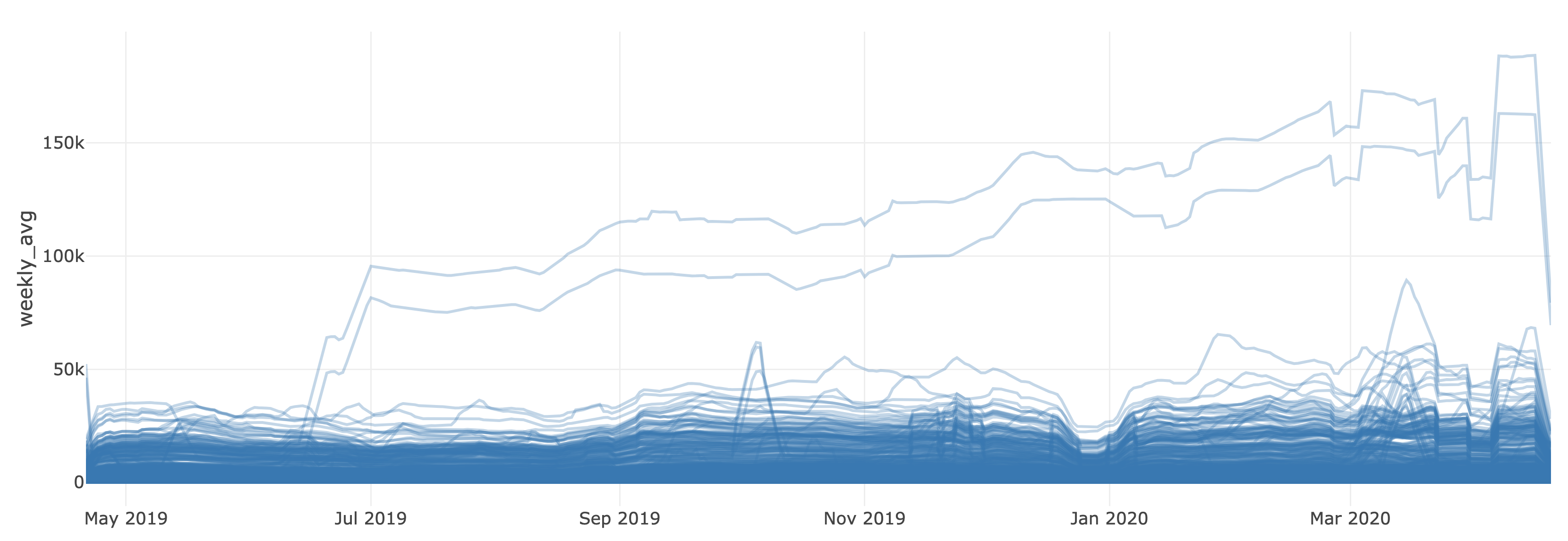 logs$weekly_avg <- zoo::rollapply(logs$count, 7, mean, fill = "extend")plot_ly(logs) %>% add_lines(x = ~date, y = ~weekly_avg, color = ~package)