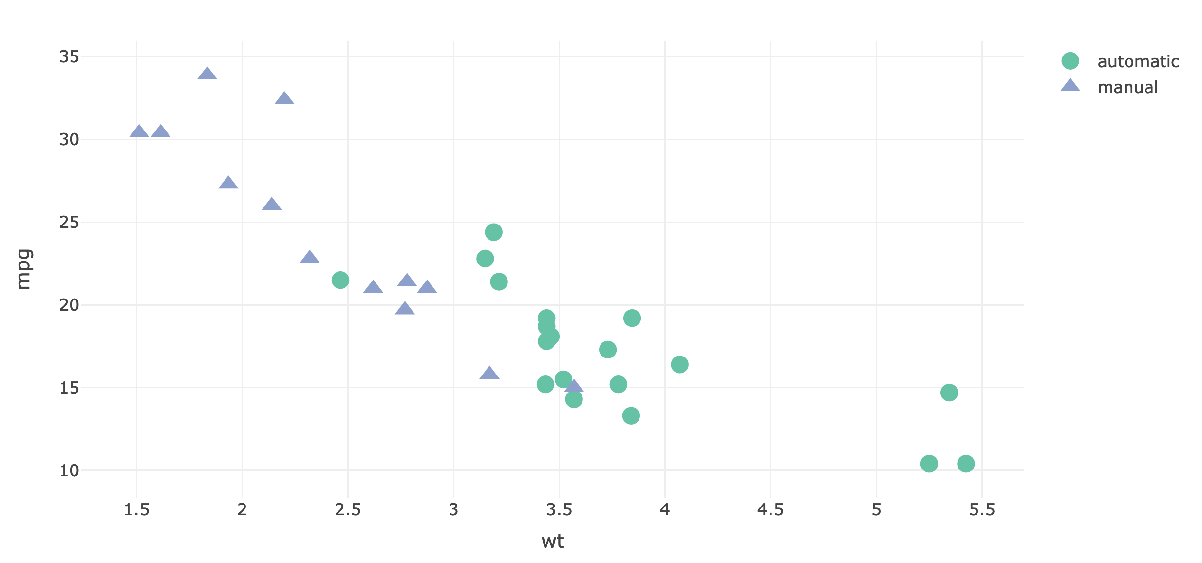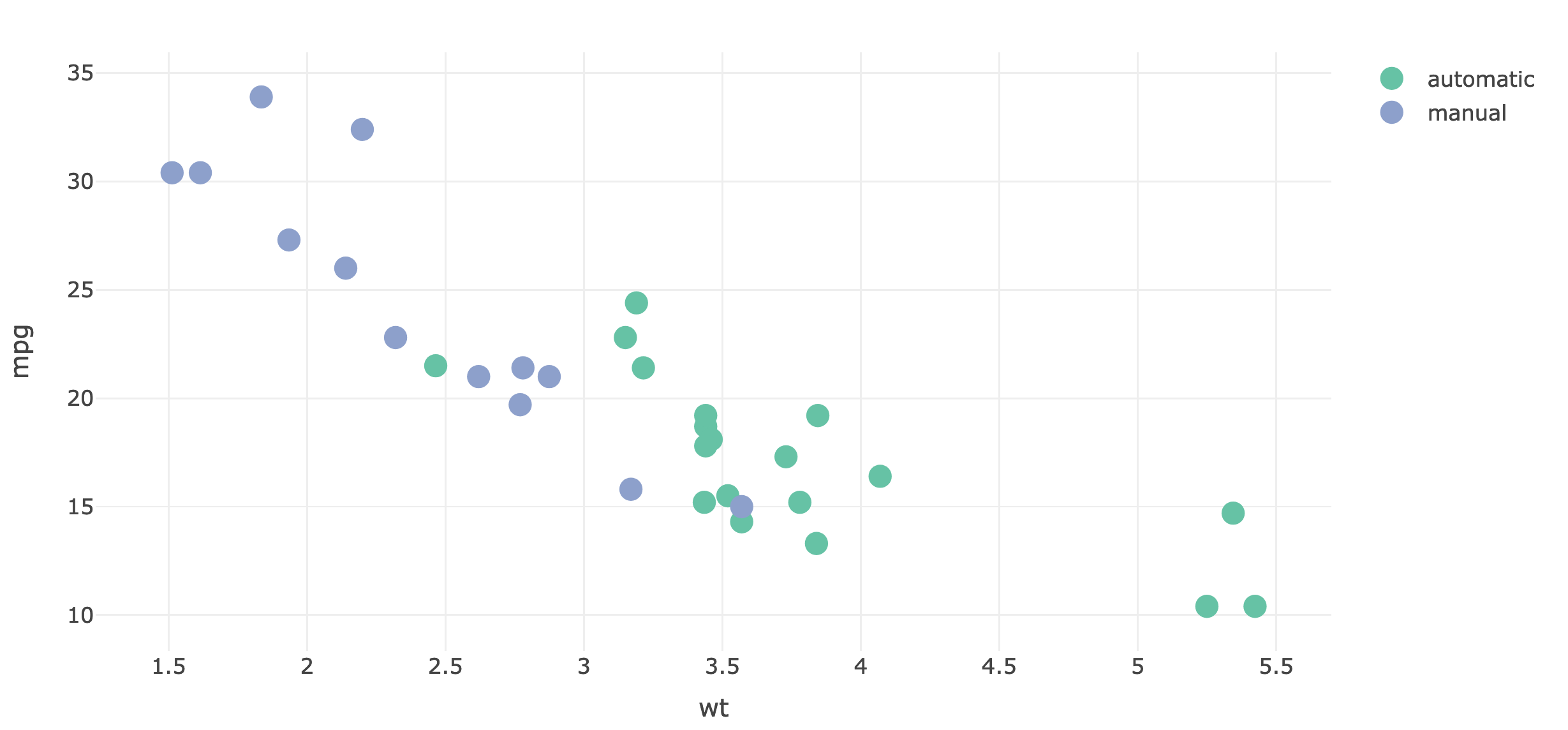 plot_ly(mtcars) %>% add_markers(x = ~wt, y = ~mpg, color = ~am)