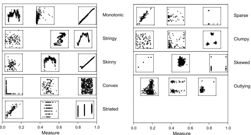 These are nine scagnostics (scatterplot-cognostics) measures from (Wilkinson and Wills, 2008). Same concept can be applied to time series (see tsfeatures package).