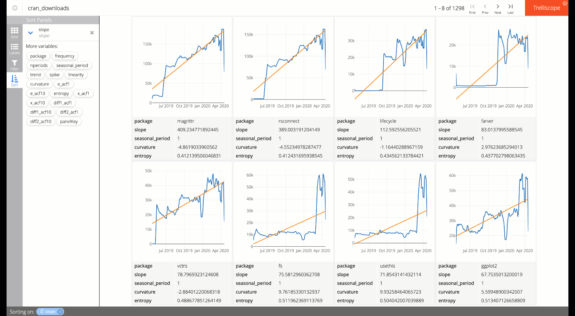 library(trelliscopejs)library(plotly)ggplot(logz) + geom_line(aes(date, weekly_avg)) + facet_trelliscope(~package, as_plotly = TRUE)